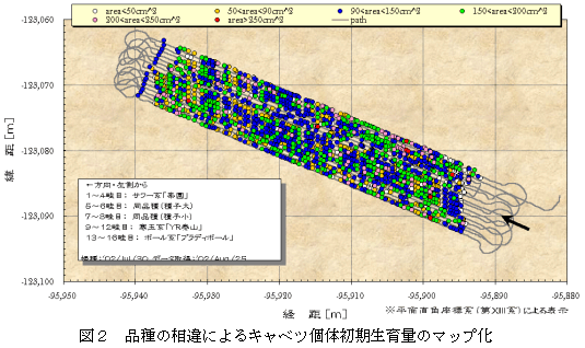 0.2m/s程度の走行速度で安定した画像データが得られ、約3.0a/hの能率でデータを収集する。収集したデータをもとに、簡易に生育マップを作成することができる(図2)。作成したマップからは、一筆圃場におけるキャベツ個体ごとの生育初期の生育ばらつきや欠株などの生育状況を容易に確認することができる。 |