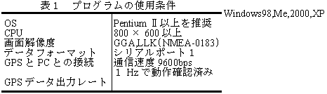 本プログラムにより地図上に位置、走行軌跡及び進行方向、経度、緯度、基準点からの距離、走行速度、補足衛星数とGPSのモードすなわちRTKGPS、DGPS、SGPSの別を表示できる(図1)。OSやGPSの出力フォーマット等の本プログラムの使用環境を表1に示す。 |