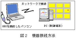 図2に示すように機器が接続された状態で、GPS側と制御端末側双方のPCで本プログラムを起動することによって、ネットワークを利用してGPSのデータを制御端末で取得することができる。データの伝送には伝送制御プロトコル(TCP)を使用している。接続が途切れた場合も制御端末から容易に再接続できる。なお、GPS側PC単体でも本プログラムは利用できる。 |