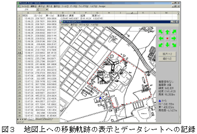 取得した位置データは表示と同時にエクセルのデータシート或いはテキスト形式で記録できる。また、記録した位置データは地図上に再表示させることができる(図3)。 |