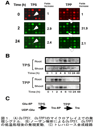遺伝子(OsTPS1)及びtrehalose-6-phosphate phosphatase 遺伝子(OsTPP1)の発現量が,12℃,2時間処理で,それぞれ2.9倍,32倍になる.ノーザン解析において,両遺伝子の発現は短時間の低温処理により一過的に誘導される(図1). |