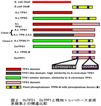 OsTPS1タンパク質はアラビドプシスのAtTPS6-11と相同性が高く,TPP様配列も持つclass II型である.OsTPP1タンパク質はアラビドプシスAtTPPAと相同性が見られる(図2). |
