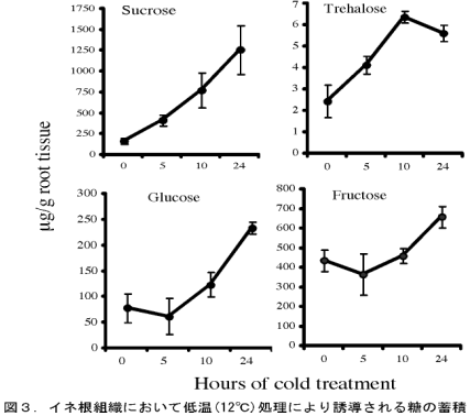 根組織におけるトレハロースの蓄積は低温処理後10時間後をピークとする一過的なものである.グルコース,フルクトースの蓄積には5時間のタイムラグがあり,トレハロース蓄積が引き金になっている(図3). |