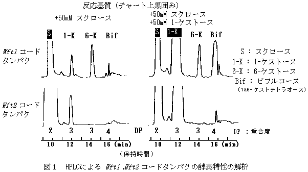 単離した2種類のcDNAをメタノール資化性酵母(Pichia pastoris)に組み込み発現させ、Wft1、Wft2がコードするタンパクの酵素学的性質の解析を行った。Wft1由来のタンパクは、スクロース(2糖)を基質として1-ケストース(3糖)、6-ケストース(3糖)、スクロースと1-ケストースを基質として、1&6-ケストテトラオース(4糖)を主に合成する活性を持つことから6-SFTである。Wft2由来のタンパクは、スクロースを基質として1-ケストースを合成する一方、1-ケストースを基質として4糖を合成する活性が低いことから、1-SSTである(図1)。 |