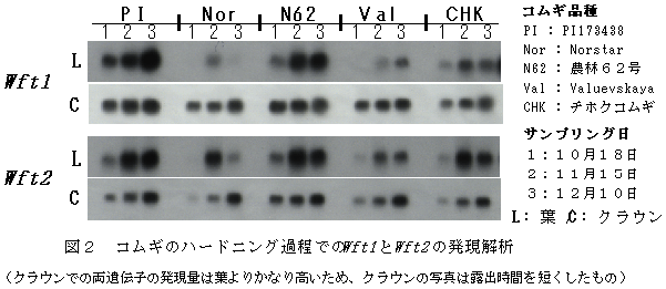 173438,農林62号)で特に発現量が多い。このことから、単離されたWft1,Wft2はともに越冬のためのフルクタン蓄積に関与する遺伝子である(図2)。 |