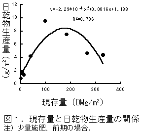 現存量と日乾物生産量の実測値から、現存量を独立変数、日乾物生産量を従属変数とする2次回帰式の係数a,b,cを最小二乗法により求める(図1)。 |