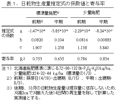 日乾物生産量は施肥水準や放牧草の生育ステージの影響を受けるため、施肥量別、時期別に個々に係数a,b,cを決定する(表1)。 |