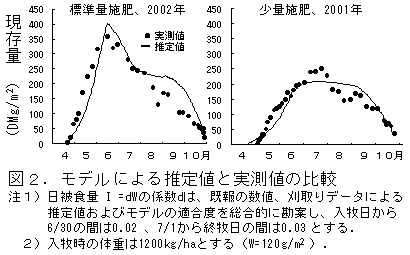 以上のように、日乾物生産量を現存量から推定する式から作成したモデルによりKB定置放牧草地の現存量推定が可能であり、このモデルを用いてシミュレーションを行うことで適切な草地管理方法について検討できる。 |