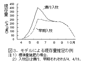 本モデルを活用する一例として、入牧時期の違いが以後の現存量の推移に及ぼす効果を予測できる。標準施肥の場合、慣行の入牧時期では春期に現存量の増加が著しく大量の余剰草が発生するのに対し、入牧を慣行から15日早めることでスプリングフラッシュが軽減し、余剰草が減少する(図3)。 |