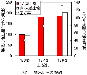 黒ボク土の表土を充填した枠圃場から小麦収穫後に土壌を採取し、クロロホルムくん蒸抽出法における土壌と抽出液の比率(土:液比)を従来の1:20から1:40、1:80とすると、抽出される無機リン量は増加し、土:液比1:40の場合には1:20の約1.5倍以上となり、くん蒸処理をした土壌から抽出される無機リン量とくん蒸処理をしていない土壌から抽出される無機リン量の差、すなわち菌体由来の無機リン量が増加するために無機リン回収率も高くなる。しかし、土:液比1:80の場合には、菌体由来の無機リン量がマイナスとなり、さらに無機リン回収率も1を越えることから、不適当と考えられる(図1)。 |