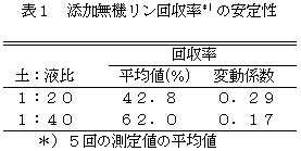 黒ボク土の表土を充填した枠圃場からインゲンマメ播種前から収穫後までの間に5回土壌を採取し、クロロホルムくん蒸抽出法で土:液比を1:40として測定すると、添加無機リンの平均回収率は土:液比1:20の約1.5倍、変動係数が約半分と安定した高い回収率が得られ、バイオマスリン測定値の精度が高くなる(表1)。 |