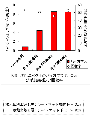 腐植質黒ボク土では、トウモロコシ畑やヤナギ植栽林として利用している土壌よりも有機物の還元量の多い草地土壌のバイオマスリンが高く(図2)、淡色黒ボク土のダイズ栽培土壌では、バーク堆肥連用区よりも厩肥施用区でバイオマスリンが高い(図3)。また、添加無機リン回収率は、いずれも50%弱からそれ以上と高い。 |