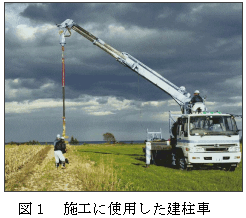 建柱車は直径40cm、深さ4m用の掘削ドリルを装備しているので、7m用のアタッチメントを追加して使用する(図1)。掘削時間は30分程度なので、移動距離が少ない場合、1日当たり10孔以上掘削できる。 |