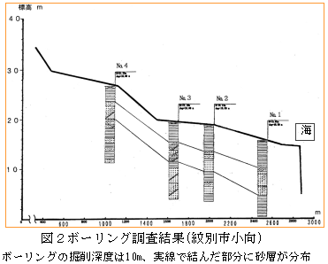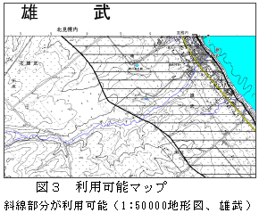 オホーツク海沿岸の重粘土は、主に海岸段丘上に分布しており、草地や畑地として利用されている。調査の結果、深さ4mや7mに砂の層が分布するのは、紋別市小向など一部の地域を除き一番低い第3(低位)海岸段丘面と、その上にある第2(中位)海岸段丘面である(図2)。そこで、1:50000地形図上に利用可能部分を斜線で示した利用可能マップをもとに、簡易排水法が利用できるかを判断する(図3)。 |