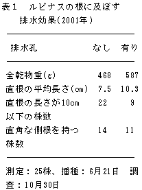 排水不良の畑を区切り、直根性のルピナスを栽培して簡易排水の効果をみると、施工により根の重量が20%以上増加し、直根が長くなる。また、施工しない部分で多くみられる根元から直角に太い根が出る株が減少する(表1)。 |