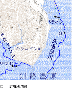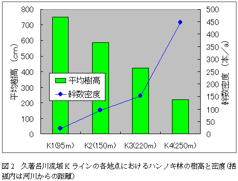比較的自然が保たれているチルワツナイ川流域と土砂流入の増加が懸念されている久著呂川流域において、植生変化のなかった地点とハンノキ林が増加した地点のそれぞれでハンノキ林を調査すると、植生変化のなかったチルワツナイ川流域(図1、CHライン)のハンノキ林は樹高・胸高直径が様々な階級からなる樹幹で成立しているのに対して、久著呂川流域(図1、Kライン)のハンノキ林はばらつきが小さく、一斉に侵入ないし萌芽再生したものと考えられる(データ略)。また、Kラインでは、川から離れるほどハンノキ林の樹高が低くなり密度は増加している(図2)。 |