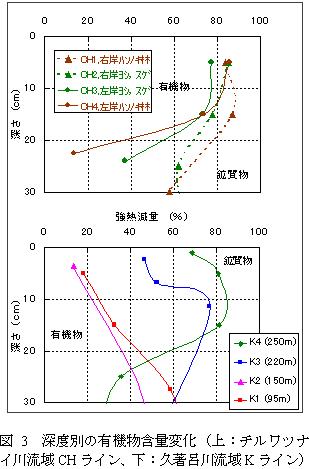 チルワツナイ川流域(CHライン)においては、草本植生でもハンノキ林でもともに地表面に向けて有機物が増加しているのに対して、久著呂川流域(Kライン)では、地表面に向かって有機物が減り、鉱質物が増加している(図3の表層部分)。 |