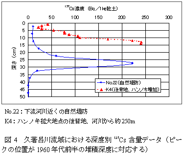 冬季に凍結した泥炭土壌をコアで採取することにより、後背湿地の湛水面下にある泥炭土壌の表層を未攪乱で採取できる。未攪乱土壌について深さ毎に137Cs濃度を分析することにより、1960年代前半以降の堆積深度が推定でき、ハンノキ林拡大地点の鉱質物の多い表層部分は近年堆積したことがわかる(図3、図4)。 |