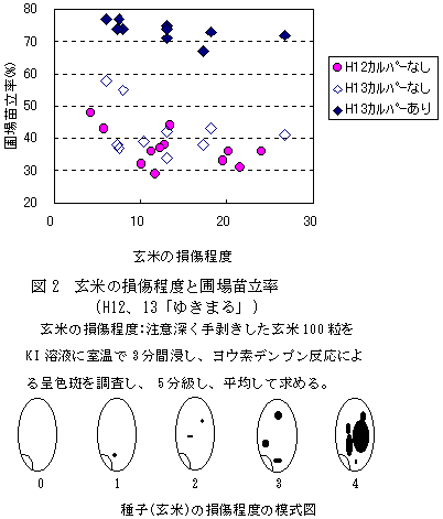 | 種子用自脱コンバインで収穫した水稲種子は、低温での発芽率がはさ掛け乾燥した種子よりも低下するので、脱穀機構の異なる汎用コンバインにより、水稲直播用種子の低温発芽率および苗立率を低下させない収穫条件を明らかにする。 | |||||||