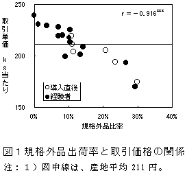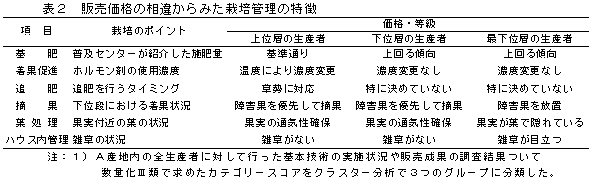 A産地内における販売価格の相違からみた栽培管理の特徴を整理すると(表2)、取引価格が上位に位置する生産者は、(1)普及センターが紹介した施肥量を基準にしている、(2)ホルモン剤の濃度を温度によって変えている、(3)草勢を見ながら追肥時期を決めている、(4)下位段において障害果の摘果を徹底している、(5)果実の通気性が確保されている、(6)ハウス内に雑草が認められない。一方、産地内で取引価格が著しく低迷していた生産者ほど、(1)下位段において障害果の取り残しが目立つ、(2)果実が葉で隠れている、(3)雑草が目立つ、結果となった。すなわち、産地内で取引価格の下位層に位置する生産者ほど、基本技術を励行していないために、規格外品の出荷率が高くなり、取引価格の低迷を招いていた。 |