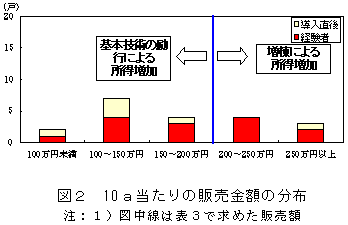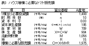 ハウスを増棟する際に必要なトマト販売額を試算した結果、10a当たり200万円の販売額を確保しなければならないことが明らかとなった(表3)。したがって、10a当たりの販売額が200万円以上である生産者は、ハウスの増棟によるトマト部門所得の増加が期待できるが(図2)、200万円以下の生産者は、まず基本技術を励行することで、面積当たりの所得を高めることが不可欠であるものと判断された(図2)。 |