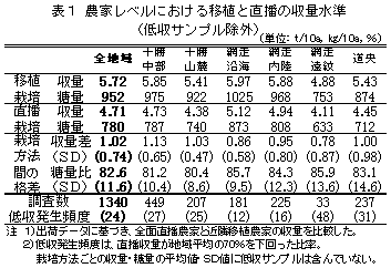 (2)直播の経営費(減価償却費を除く)は移植に比較し8,217円少ない。これは基準糖分のてんさい500kg程度に相当する。したがって、直播の所得を移植より高めるために許容される収量格差500kg/10a以内が目標となる。