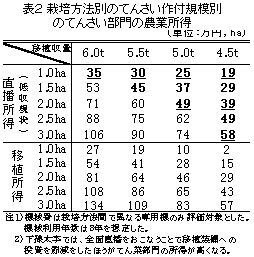 てんさい小規模作付を想定した試算によると、てんさい作付規模が2ha程度以下の経営では、全面直播の採用によって機械投資が節減でき、農業所得が向上する(表2)。 |