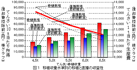 (4)てんさい1t当たり生産費(償却費を除き労働費を含む)の試算によると、移植収量5.5t/10a以下の地帯では、直播における1t当たり生産費は移植より低い(図1)。