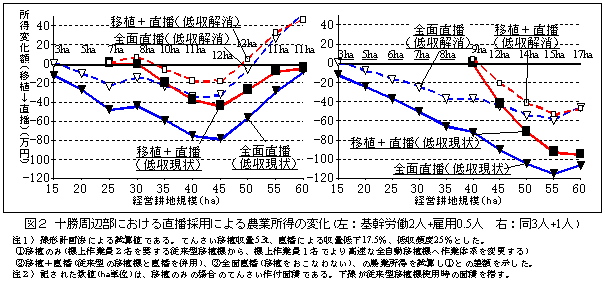 十勝周辺部(てんさい移植収量5.3t)における現状程度の直播の低収頻度を前提とした試算によると、夫婦のみで雇用確保が困難な経営では、耕地規模40〜45haを除けば、移植のみと移植と直播の併用との所得格差はわずかである。また、低収が解消すると、50ha以上では全面直播で所得向上が見込まれる(図2左)。すなわち、従来型移植機で作付拡大が困難となるてんさい作付規模8ha以上では、直播を併用して作付を拡大することで、全自動移植機を導入した場合と遜色ない所得が達成されるとともに軽労化が計られる。さらに併用の経験を経ることにより、直播収量の安定化が可能となれば、全面直播の有利性も生じてくる。一方、労働力の豊富な経営(図2右)や単収の高い十勝中央部では、直播による農業所得向上効果は小さい。 |