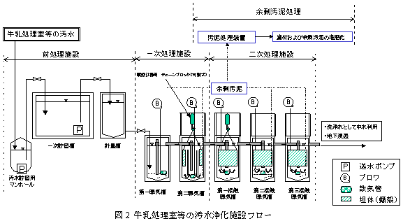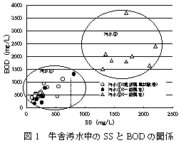 搾乳施設の汚水性状は機械室・牛乳処理室・搾乳室の作業通路から排出されたふん尿混入の少ない汚水(1)と、これに搾乳ストール・牛用通路の洗浄水が加わったふん尿混入の多い汚水(2)の2種類に分類される(図1)。 |