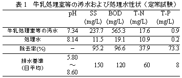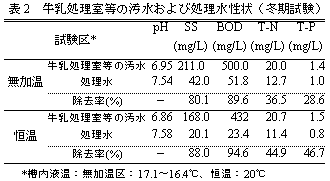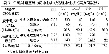 日量5Lの廃棄乳が添加された汚水(BOD:1140mg/L)の浄化能は、定常運転に比べ低下するが、排水基準を満たす。日量10Lの廃棄乳添加(BOD:1750mg/L、設計限界負荷の1.7倍)では、窒素、リンの排水基準(日平均)を満たすことができない