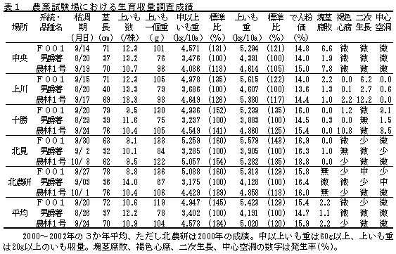 「農林1号」並の中晩性で、目が浅く、「男爵薯」及び「農林1号」より大粒・多収である(表1)。 |