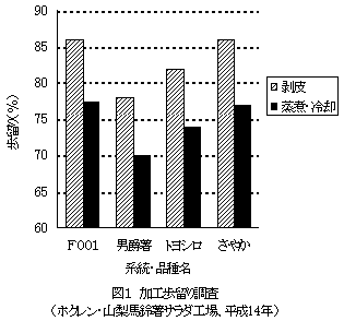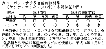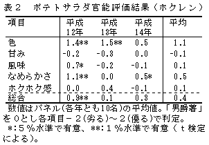 ポテトサラダ製造時の歩留りは、主力品種である「トヨシロ」や「男爵薯」より高い(図1)。ポテトサラダの官能評価では、色や食感の評価が高く、総合的にポテトサラダ適性が優れる(表2、表3)。 |