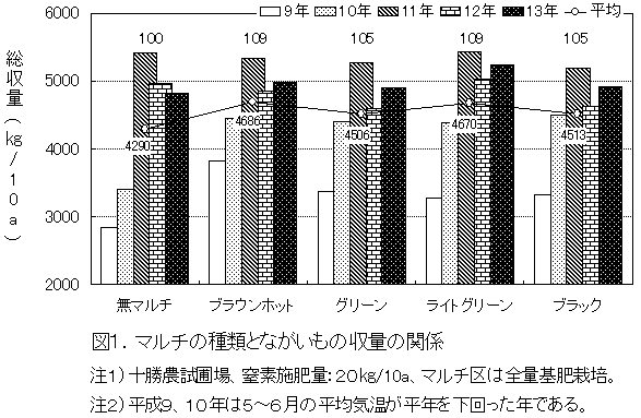十勝地域においては、マルチの効果は5〜6月の平均気温が平年を下回る年に認められる。マルチ の種類による比較ではブラウンホット、ライトグリーンでの増収効果が高い(図1)。 |