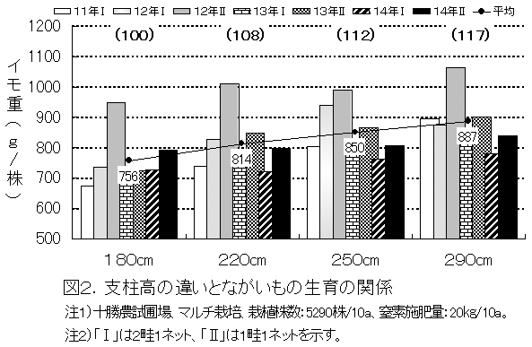 支柱を高くすることでイモの肥大は旺盛になり、180cmに対して290cmではイモ重が17%増加する(図2)。 |