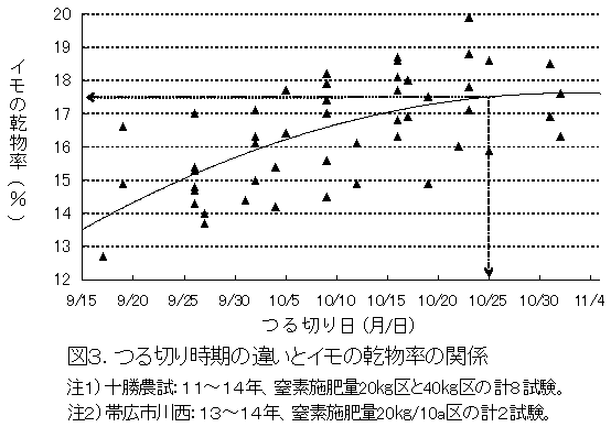 収穫前に行うつる切り時期の違いがイモの乾物率に及ぼす影響は大きい。品質面における低下を防ぐ意味では、つる切り時期は乾物率の増加曲線がほぼ横ばいとなる10月25日以降とすることが望ましい(図3)。 |