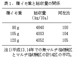 種イモ重が90gの場合ではやや収量が低くなるが、105gと120gではほとんど差がなくなること から、産地の平均である120〜130gの種イモ重を1個100gとすることで種イモ代にかかるコストを