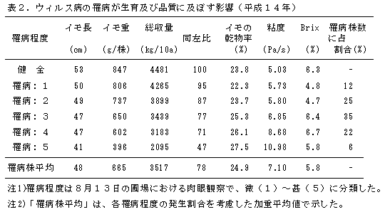 やまのいもえそモザイクウィルス罹病株は健全株に対して最大で約50%も減収する。しかし、ウィルスに罹病することによってイモの乾物率や粘度の値は高まる(表2)。 |