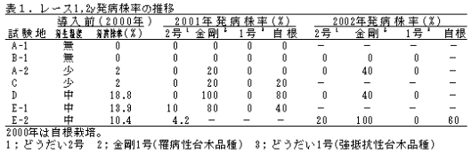 前年自根発病株率10%以下の圃場では、抵抗性台木品種「どうだい2号」の導入により安定したレース1,2y発病抑制効果が認められるが、10%以上の圃場では発病株率が増加する事例も認められる(表1)。 |