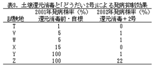 前年自根発病株率10%以上の圃場でも、1〜2年のトマト栽培または土壌還元消毒と「どうだい2号」導入を組合せることにより、レース1,2y発病株率を低下させることが可能である(表2,3)。 |