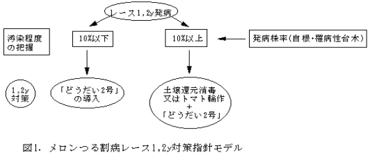 以上の結果による、「どうだい2号」導入によるメロンつる割病レース1,2y対策指針モデルを示す(図1)。 |