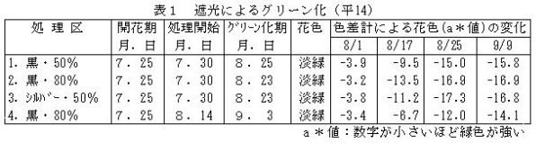 | ハイドランジア・アナベル、遮光、グリーン化、摘心、開花調節 | |