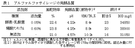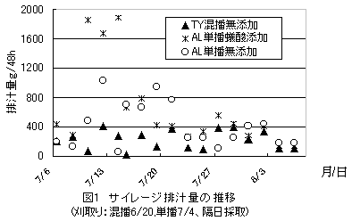 蟻酸製剤あるいは酵素・乳酸菌複合製剤の添加により、排汁量が増加する(表3)。特に、蟻酸製剤の添加は詰込み直後から1週間程度の間に増加する(図1)。高水分アルファルファサイレージの排汁は各処理ともBODが30000mg/L以上であり、系外への無処理での排出は環境に悪影響を及ぼすと予想される。 |