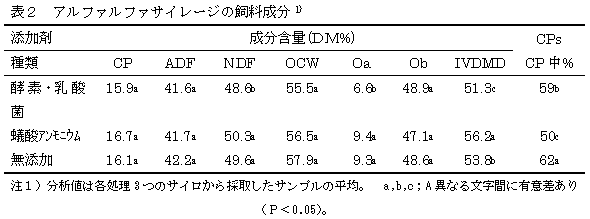 蟻酸製剤あるいは酵素・乳酸菌複合製剤(Acremonium cellulolyticus由来×Lb.casei subsp.rhamnosus)の添加はpH、VBN、およびCPs含量を低下させることから、発酵品質の改善に有効である(表1)。また、酵素・乳酸菌複合製剤の添加では繊維が分解されることからOa含量およびNDF含量の低下が認められる(表2)。 |