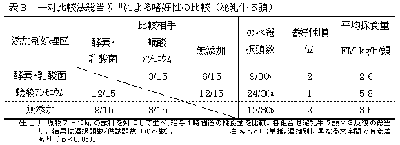 一対比較法により嗜好性の比較を行ったところ、無添加条件に比べ、蟻酸製剤添加では嗜好性の改善が認められたが、酵素・乳酸菌複合製剤の添加では、嗜好性の改善は認められない。 |