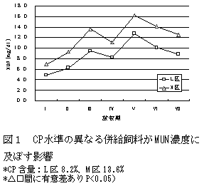 併給飼料中の圧片トウモロコシに対す大豆粕の比率を変えたL区(CP8.2%)とM区(CP13.6%)では、各放牧期において両区のMUN濃度に有意な差が認められる。併給飼料のCP含量の違いは、MUN濃度に大きく影響する(図1)。 |