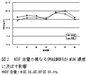 日本飼養標準の推奨養分含量(4.9〜5.3)に基づくTDN/CP比からMUN濃度を推定すると、10.1〜12.1mg/dlとなる。また、日本飼養標準で推奨されている放牧期TDN/CP比の下限値4の時、MUN濃度は17.2mg/dlと推定される。 |