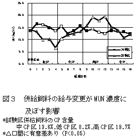 以上のことから、放牧期におけるMUN濃度は10〜12mg/dlが適正値であり、上限値として17mg/dlが目安となる。また、MUN濃度は飼料変更後、翌日には変動することから、サンプリング前日および当日の放牧状態や併給飼料の変更には注意を要する。 |