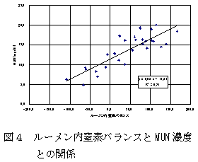 度は、強い相関があり(r=0.84)(図4)、ルーメン内窒素バランスが0g/日の時、