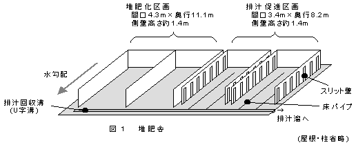 作製した堆肥舎(図1)は中仕切り壁を設けて4つの区画に分け、ふん尿堆積物を定期的に切り返しを兼ねた移動を行うようにする。また、2区画は床にパイプ、壁にスリットを入れ、ふん尿からの排汁除去をはかるようにし(排汁促進区画)、残り2区画はパイプ、スリットのない区画とする(堆肥化区画)。